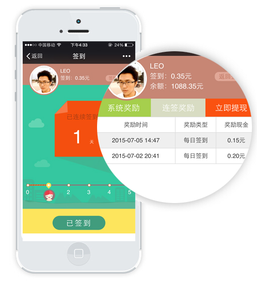 积分签到、现金签到,关注公众号的粉丝,即可点击签到, 签到后系统自动赠送积分或现金,可设置每天金额、翻倍金额、连签奖励金额等,增加会员与网站互动,提高用户 粘性和商城活跃度。